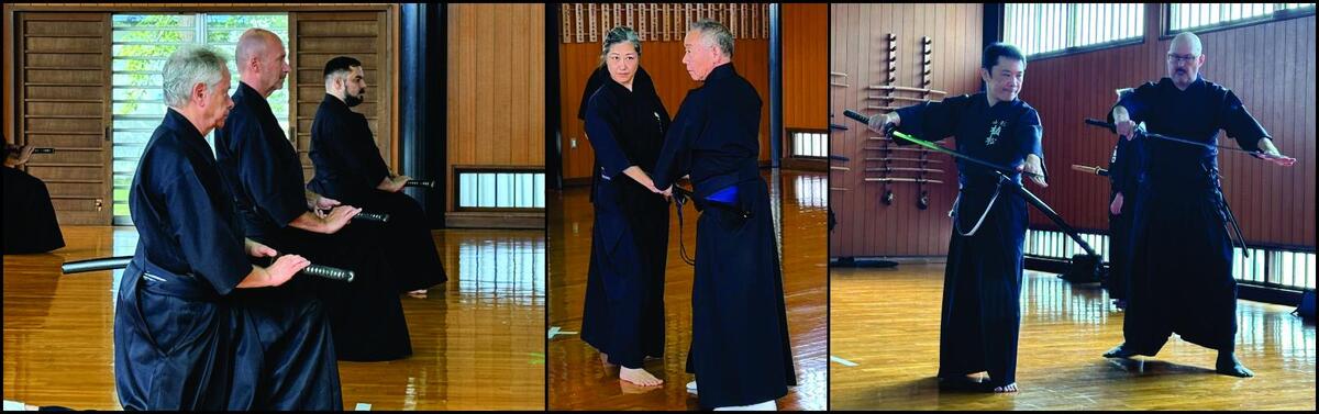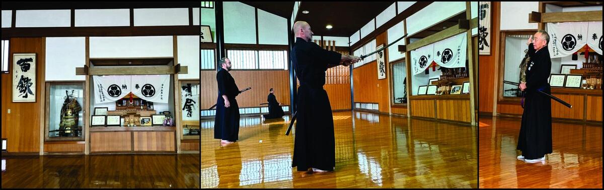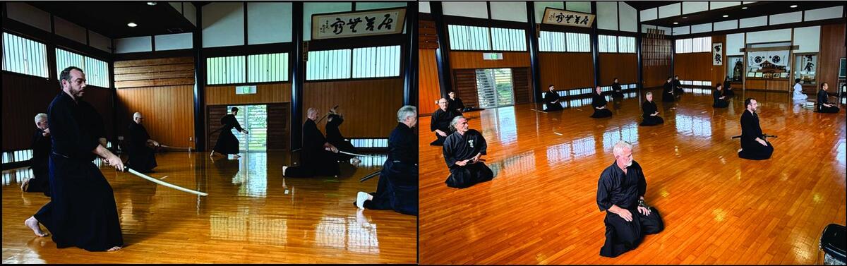 Initially, we were separated by dojo, with the two groups facing each other across an open center section of the floor. Ito Sensei or Higuchi Sensei would present a form, calling attention to important details, and then we would practice. For some forms, Ito Sensei and Higuchi Sensei would demonstrate the application of the form against an opponent. For these lessons, Higuchi Sensei would use a bokken (wooden sword) and Ito Sensei would invert his sword so that he was never presenting the ha (edge) toward Higuchi Sensei. Eventually I began to suspect that they were both using shinken (“live,” i.e., sharpened steel blades) for their forms.
